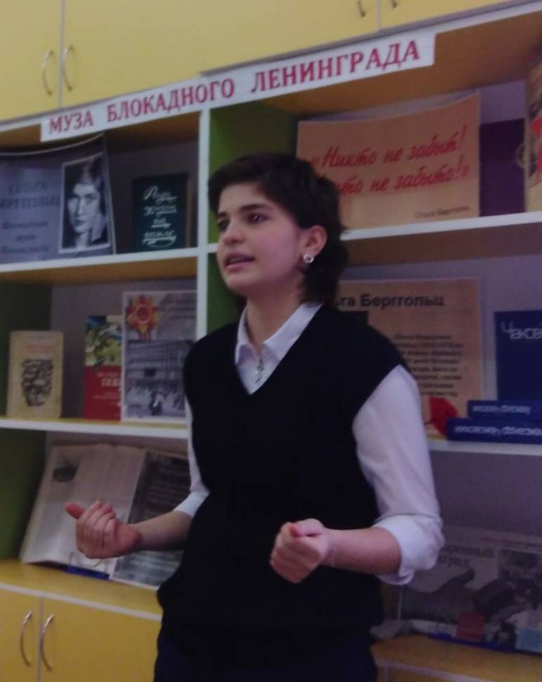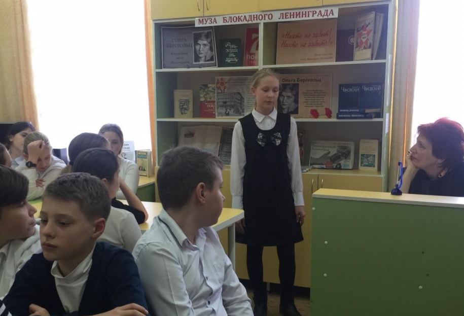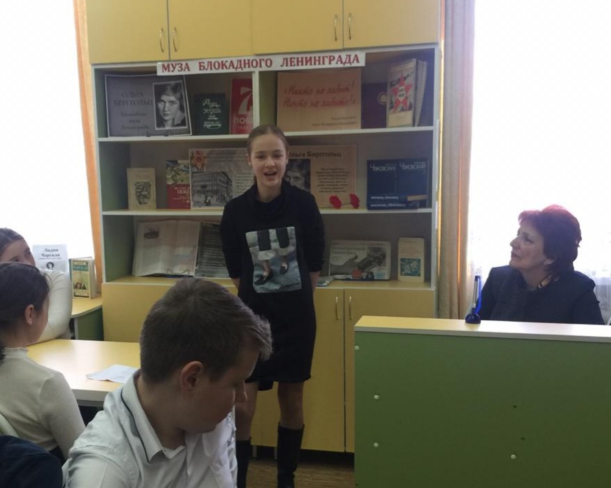 22 января в школьной библиотеке прошел час поэзии "Муза блокадного Ленинграда". Учащиеся 5-6-х классов познакомились с творчеством Ольги Берггольц, читали ее стихи. Ребята узнали, что слова " Никто не забыт, ничто не забыто", ставшие девизом памяти и скорби, принадлежат великой поэтессе