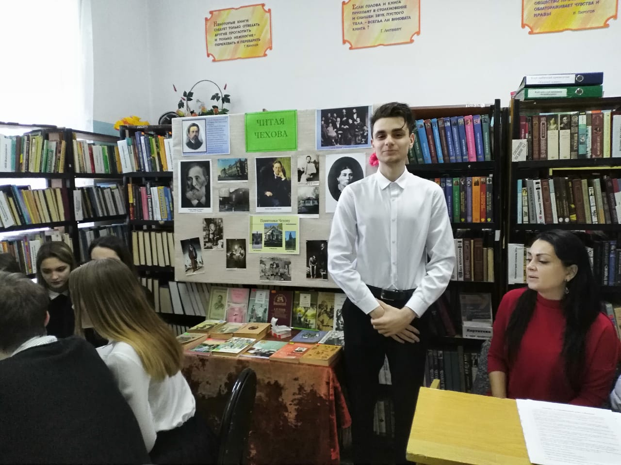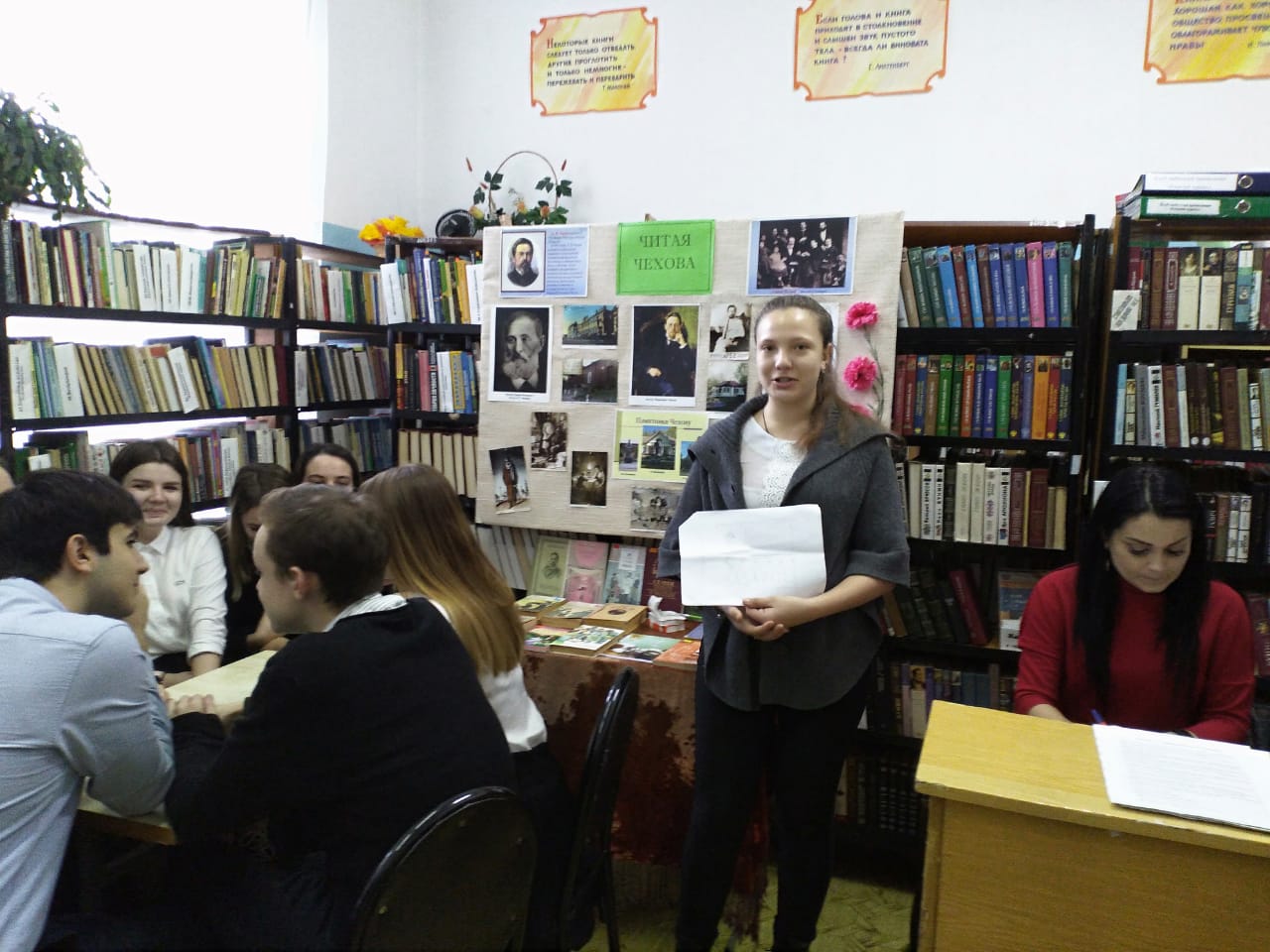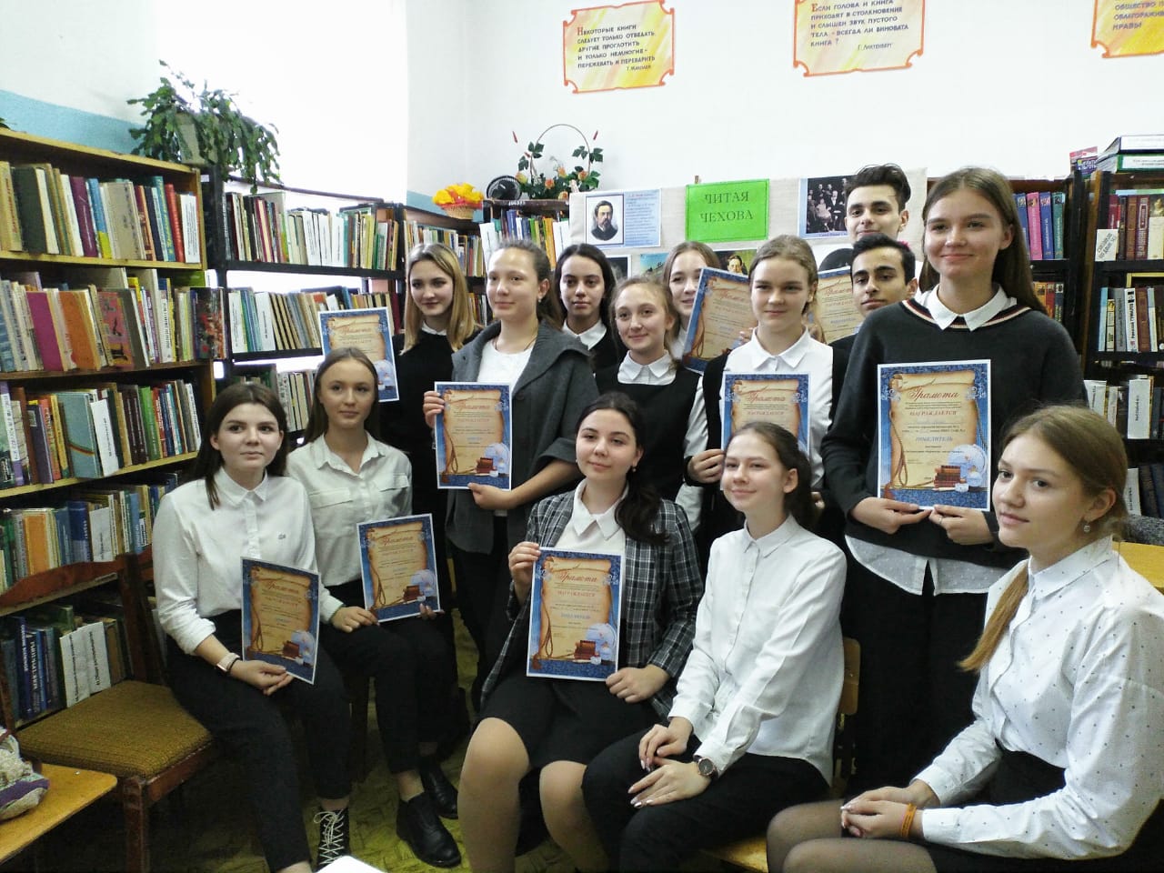 29 января учащиеся 10-х классов приняли участие в литературной игре "Читая Чехова" в городской Библиотеке # 1. Ребята рассказывали о произведениях А.П.Чехова, защищали иллюстрации, разгадывали кроссворд, отвечали на вопросы викторины. В упорной творческой борьбе победила команда 10-А класса.