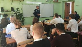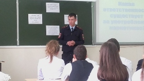 19.04.2018г. 18 апреля в рамках курса «Я принимаю вызов» и реализации программы «Антинарко» для учеников 9-х классов состоялся тренинг с элементами ролевой игры «Моя ответственность в сфере незаконного оборота наркотиков». В качестве гостей присутствовали: школьный участковый Ковтун Д.В. и психолог-практикант Мухина И.И.